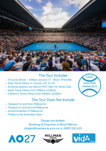 - 4 x 1 ½ hour morning tennis sessions (7:30-9:00am)